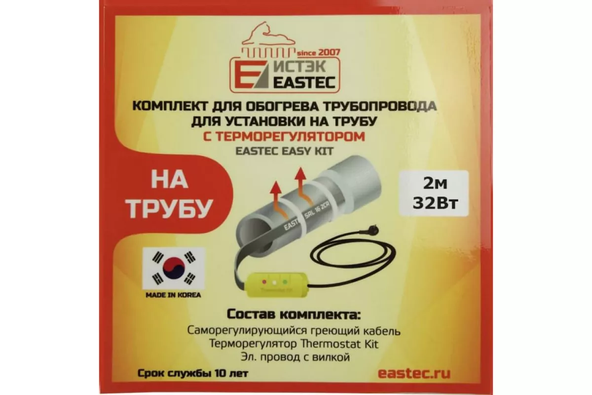 EK-02 EASTEC комплект для обогрева трубопровода(2м-32 Вт) идеально подходит для обогрева водопроводных и канализационных труб, а также систем водоснабжения на открытом воздухе, в неотапливаемых помещениях, на дачах и в загородных домах.