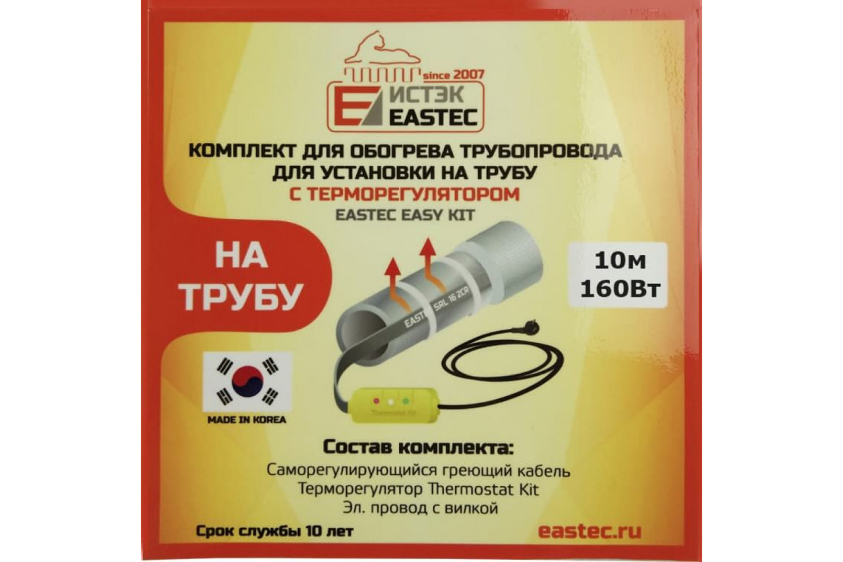 EK-10 EASTEC комплект для обогрева трубопровода(10м-160 Вт) идеально подходит для обогрева водопроводных и канализационных труб, а также систем водоснабжения на открытом воздухе, в неотапливаемых помещениях, на дачах и в загородных домах.
