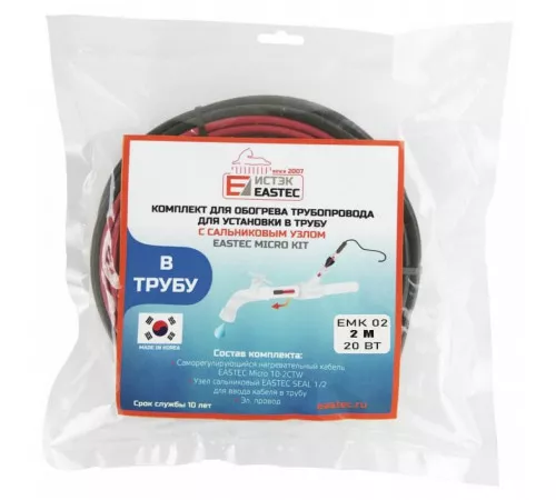 EMK-02 EASTEC комплект обогрева трубопровода для установки в трубу (2м-20 Вт) — это надежное, энергоэффективное и безопасное решение для защиты трубопроводов от замерзания. Благодаря простоте установки и долговечности, этот комплект станет отличным выбором для обеспечения бесперебойной работы водоснабжения в холодное время года.