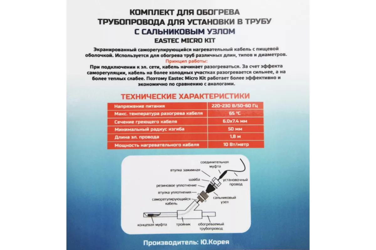 EMK-10 EASTEC комплект обогрева трубопровода для установки в трубу (10м-100 Вт) — это надежное, энергоэффективное и безопасное решение для защиты трубопроводов от замерзания. Благодаря простоте установки и долговечности, этот комплект станет отличным выбором для обеспечения бесперебойной работы водоснабжения в холодное время года.