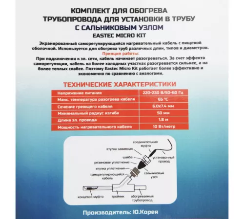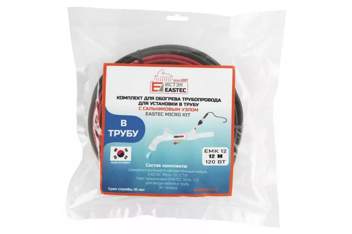 EMK-12 EASTEC комплект обогрева трубопровода для установки в трубу (12м-120 Вт) — это надежное, энергоэффективное и безопасное решение для защиты трубопроводов от замерзания. Благодаря простоте установки и долговечности, этот комплект станет отличным выбором для обеспечения бесперебойной работы водоснабжения в холодное время года.
