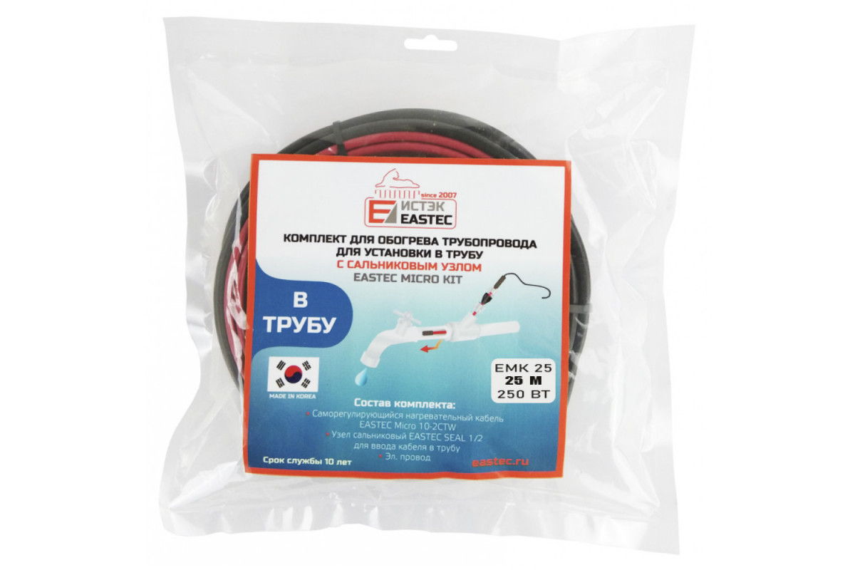 EMK-25 EASTEC комплект обогрева трубопровода для установки в трубу (25м-250 Вт) — это эффективное решение для защиты водопроводных систем от замерзания. Он предназначен для установки внутри труб, обеспечивая надежный обогрев в холодное время года.​