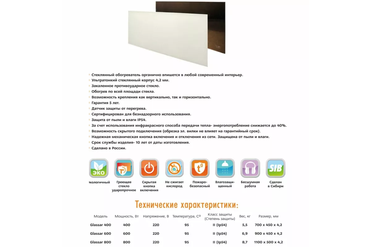 Инфракрасный обогреватель Теплофон ЭРГН-0.8 Glassar (белый) Преимущества: