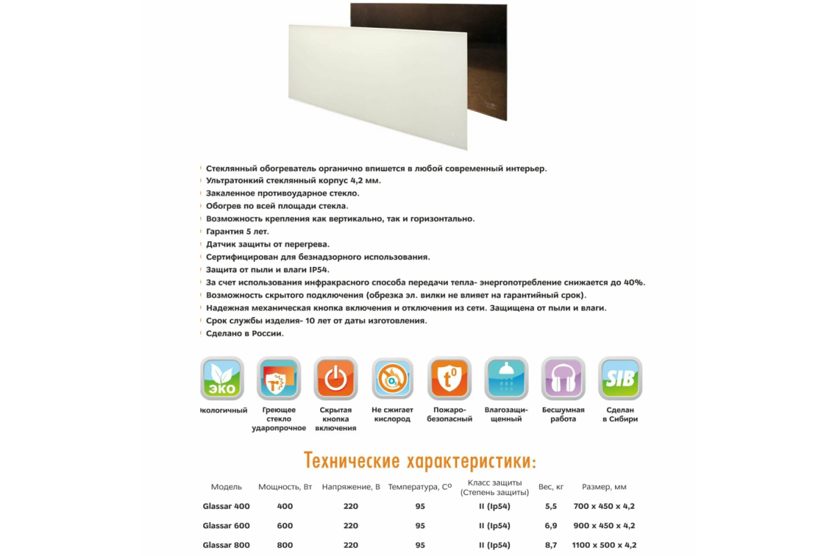 Инфракрасный обогреватель Теплофон Glassar ЭРГН 0.4 (белый) Преимущества: