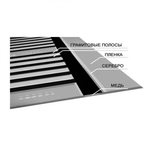 Полотно теплого пола представляет собой несколько рядов полос из углеродного материала 15 мм шириной. Полосы объединены между собой медными шинами с серебряным покрытием и служат для проведения электрического тока. Для защиты от влаги, механических воздействий и возгорания. Места прохождения нагревательного элемента заламинированы слоем плотного полимера, который не задерживает инфракрасные лучи.