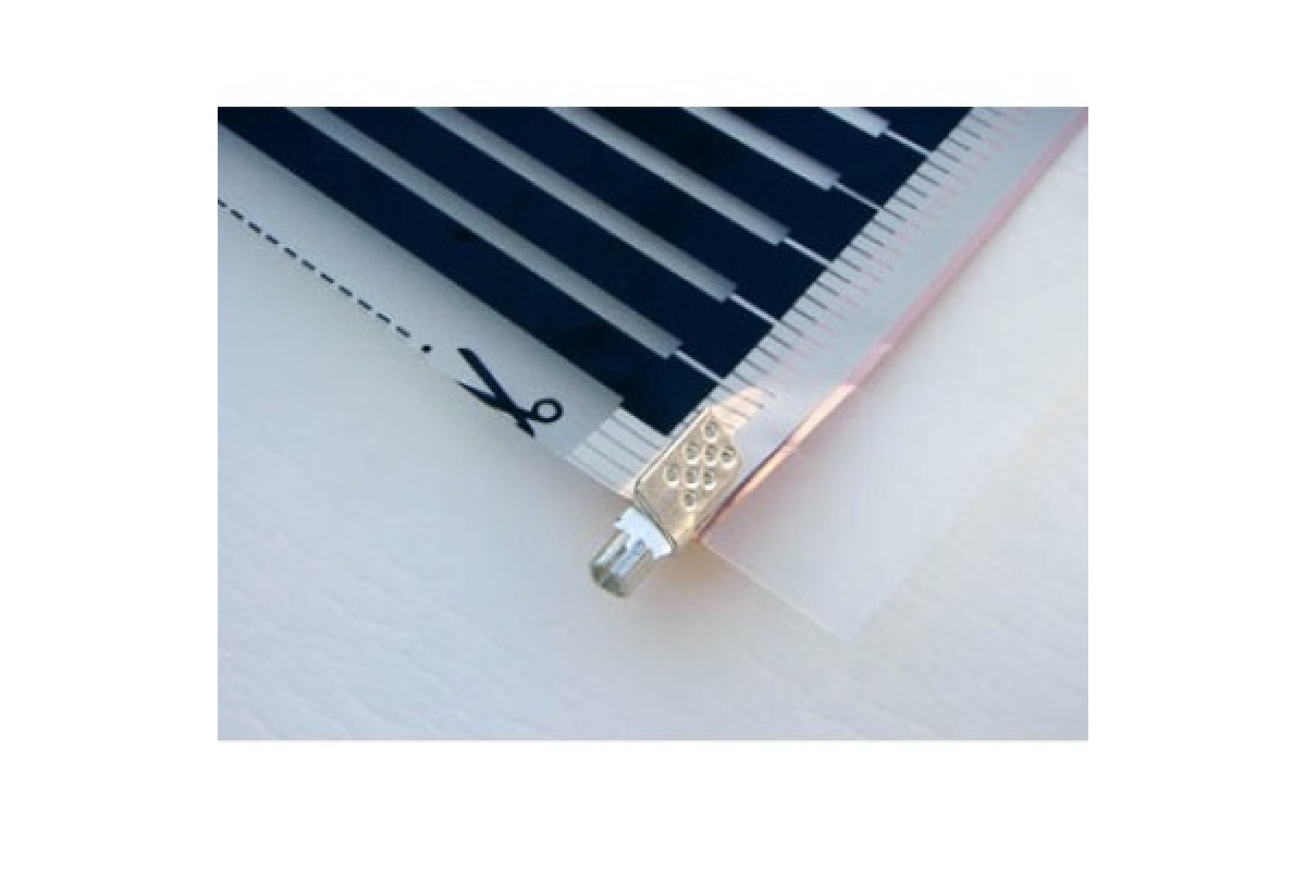 Инфракрасный пленочный теплый пол состоит из полос углеродного материала шириной около 1,5см, которые соединены между собой при помощи медных шин с серебряным покрытием, которые и проводят электрический ток. Нагревательный элемент заламинирован с двух сторон плотным полимером, который не задерживает инфракрасное излучение и обеспечивает отличную защиту от попадания влаги, пробоев и возгорания.