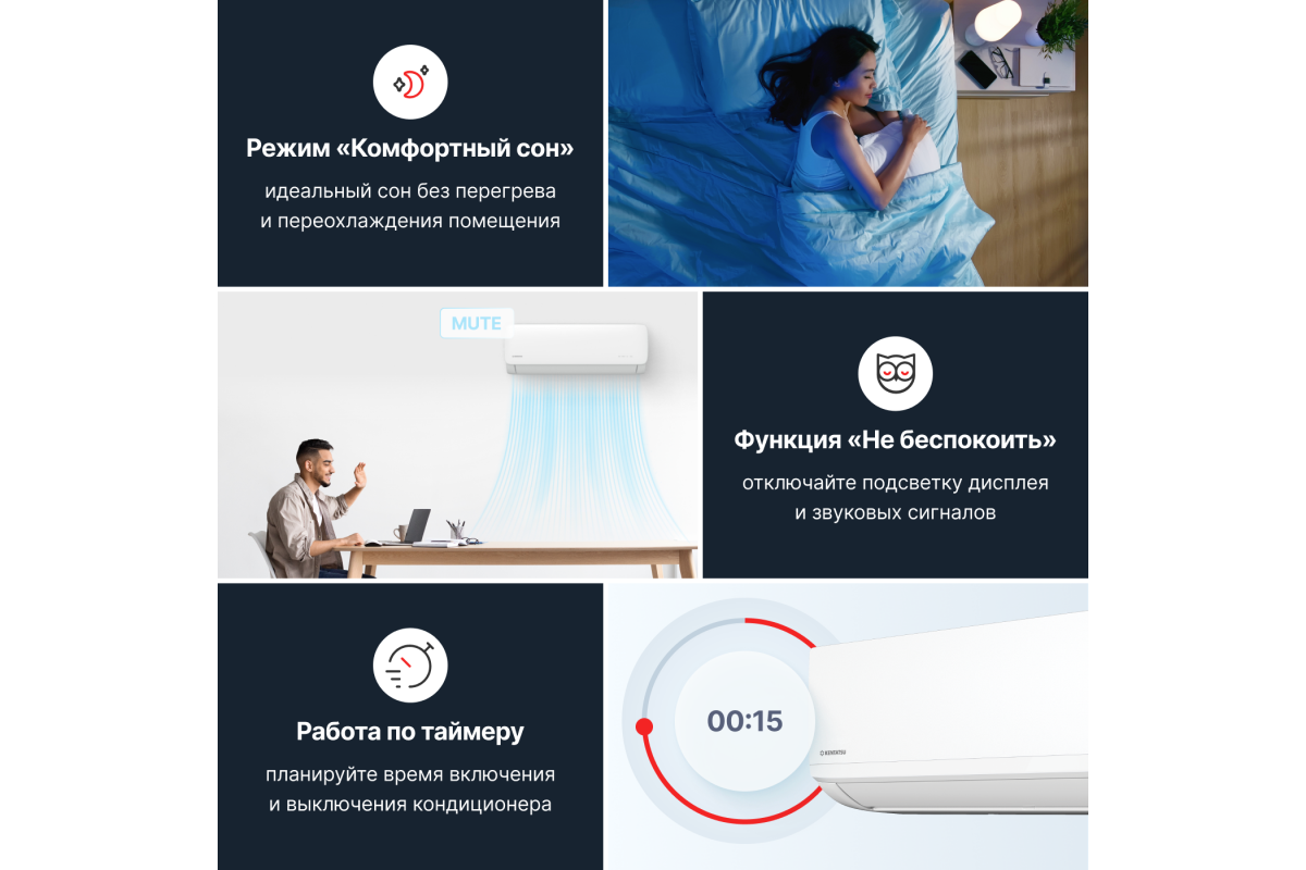 Низкий уровень шума: работа кондиционера практически не заметна благодаря уровню шума всего 20,5 дБ(А), что особенно важно для спален и рабочих кабинетов.