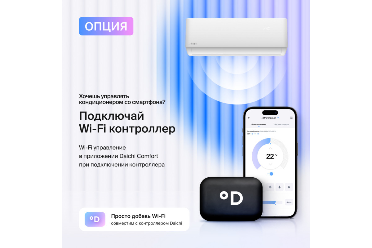 Wi-Fi управление: возможность удаленного онлайн-управления через приложение «Облако Даичи» (контроллер приобретается отдельно), позволяющее контролировать работу кондиционера из любой точки мира.