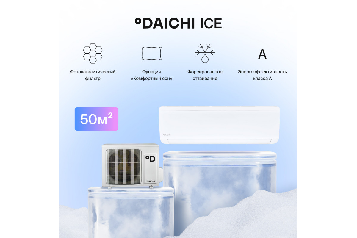 Настенная сплит-система Daichi Ice ICE50AVQ1-1/ICE50FV1-1 идеально подходит для помещений площадью до 50 м² . Это оптимальный выбор для спальни, детской комнаты, кабинета или небольшой студии.