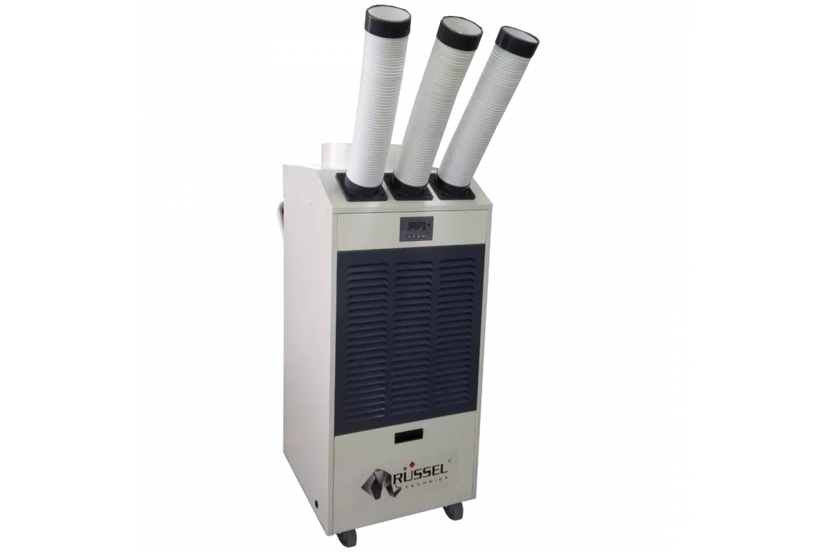 Мобильный промышленный кондиционер RŬSSEL Technics RPAC-47H представляет собой единый корпус, установленный на колеса для передвижения. Основными частями кондиционера являются: испаритель (расположен на передней панели, закрытый фильтром и защитной решеткой), конденсатор (расположен сзади кондиционера и закрыт решеткой), компрессор, вентиляторы конденсатора и испарителя, панель управления (расположена на передней панели кондиционера), ручка для передвижения, воздухораздающий патрубок, защитная решетка вентилятора конденсатора, сетевой шнур. Оборудование полностью заправлено хладагентом и готово к работе. Детальное описание кондиционера, инструкция по эксплуатации, обслуживанию и ремонту представлены в разделе Тех. Информация.