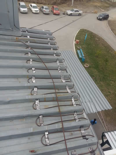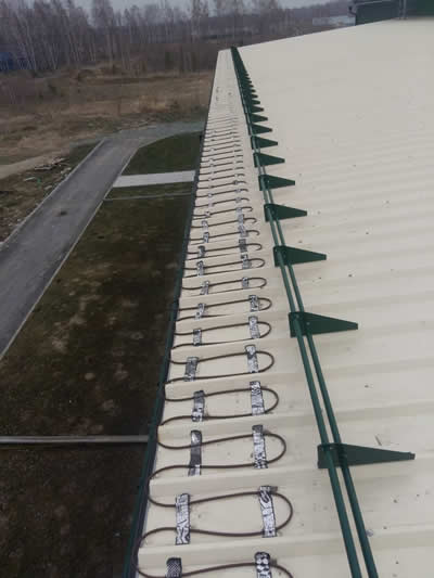 Для защиты крыши от скопления льда и образования сосулек на карнизе здания уложено 350 метров саморегулирующегося кабеля SRL 30-2CR с ультрафиолетовой защитой, производства Корея. Это надежный и безопасный кабель высокого качества. Греющий кабель проложен и по всем водостокам, для беспрепятственного отвода талой воды.