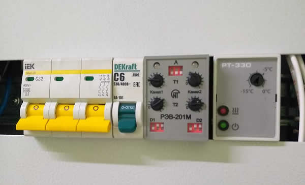 Для успешной и контролируемой работы антиобледенительной системой подключено специальное управление. В данном случае применили электронный регулятор температуры РТ-330. Он предназначен для управления подобными системами в заданном регулируемом диапазоне температур с использованием выносного датчика температуры. Дополнительно установили автомат защиты и реле времени.