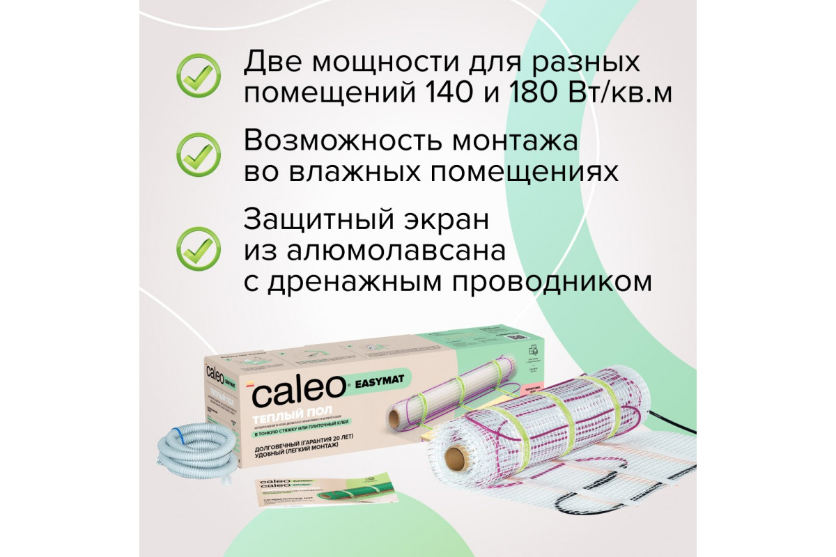 С удельной мощностью 180 Вт/м², CALEO EASYMAT эффективно обогревает помещение, при этом потребляя минимальное количество электроэнергии. Это делает его отличным выбором для основного или дополнительного отопления.
