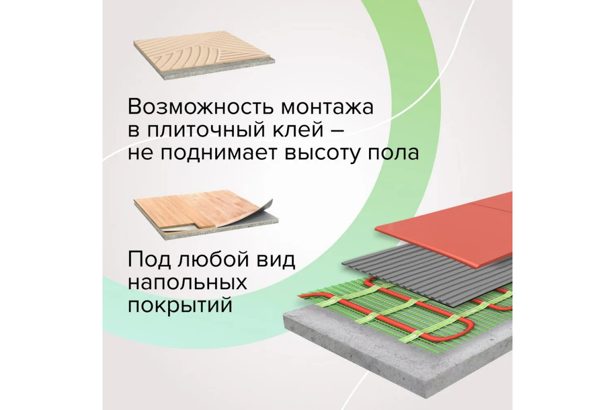Главное преимущество этого мата – быстрый и простой монтаж благодаря тонкой конструкции и готовой сетчатой основе. Вам не нужно рассчитывать шаг укладки – кабель уже закреплен на стекловолоконной сетке, что гарантирует равномерный нагрев и экономию времени при установке.
