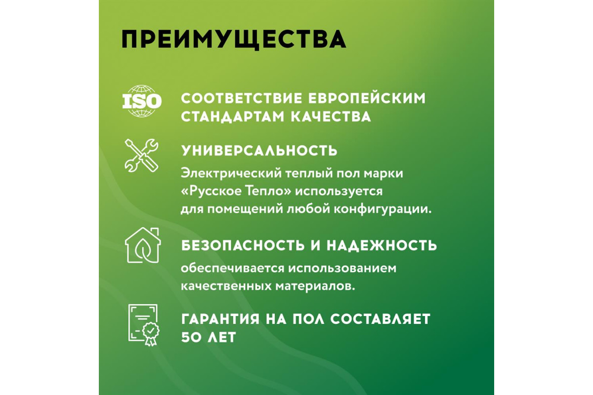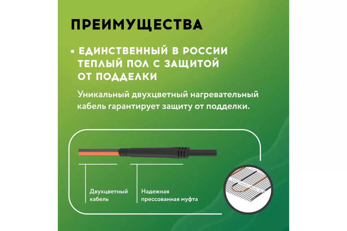 Нагревательный мат для теплого пола Русское тепло 4.0 м² 640 Вт сочетает в себе эффективность, надежность и простоту установки. Он обеспечивает комфортный обогрев пола, экономию энергии и подходит для использования в различных помещениях. Благодаря высоким стандартам качества и безопасности, этот мат является отличным выбором для создания теплого пола в вашем доме.