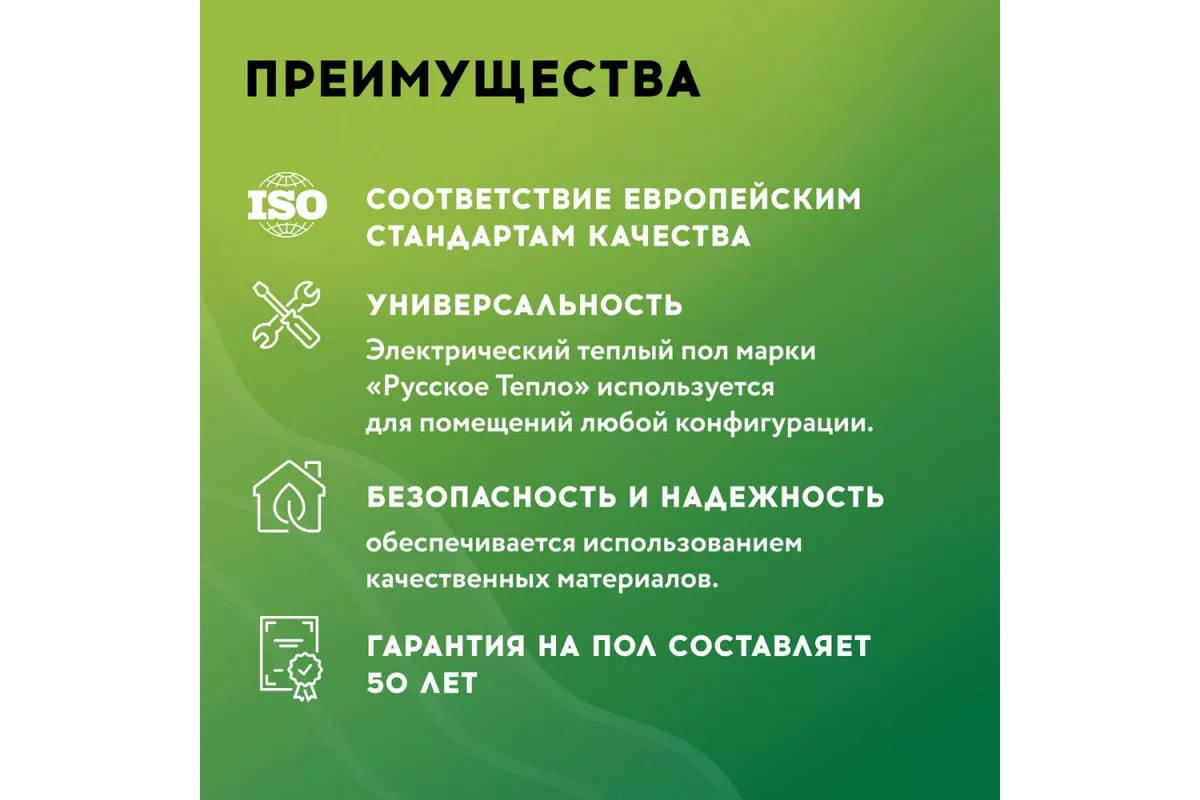Нагревательный мат для теплого пола Русское тепло 4.5 м² 720 Вт сочетает в себе эффективность, надежность и простоту установки. Он обеспечивает комфортный обогрев пола, экономию энергии и подходит для использования в различных помещениях. Благодаря высоким стандартам качества и безопасности, этот мат является отличным выбором для создания теплого пола в вашем доме.