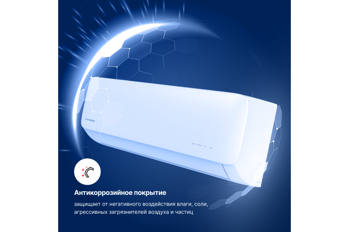 • Покрытие Golden Fin: антикоррозийное покрытие теплообменника защищает устройство от негативного воздействия влаги и агрессивных загрязнителей, продлевая срок службы кондиционера.