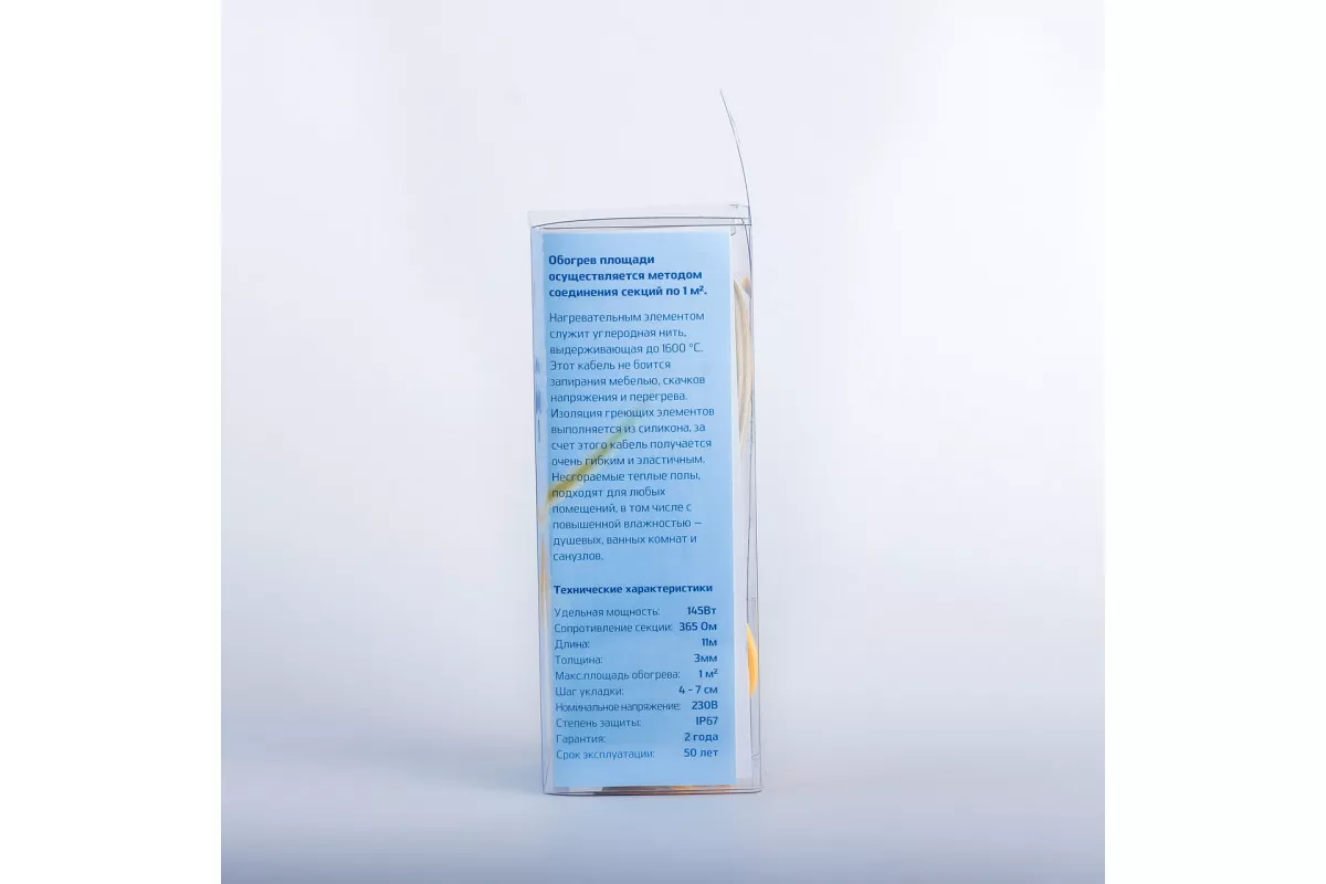 Удельная мощность системы составляет 145 Вт/м², что позволяет быстро прогревать поверхность пола и поддерживать комфортную температуру при минимальных затратах энергии. Гибкая структура кабеля обеспечивает равномерное распределение тепла по всей площади помещения.
