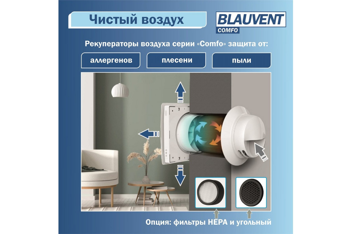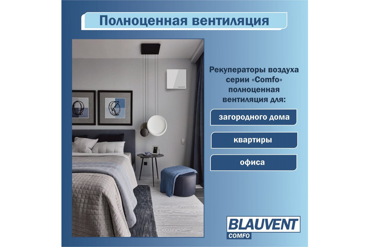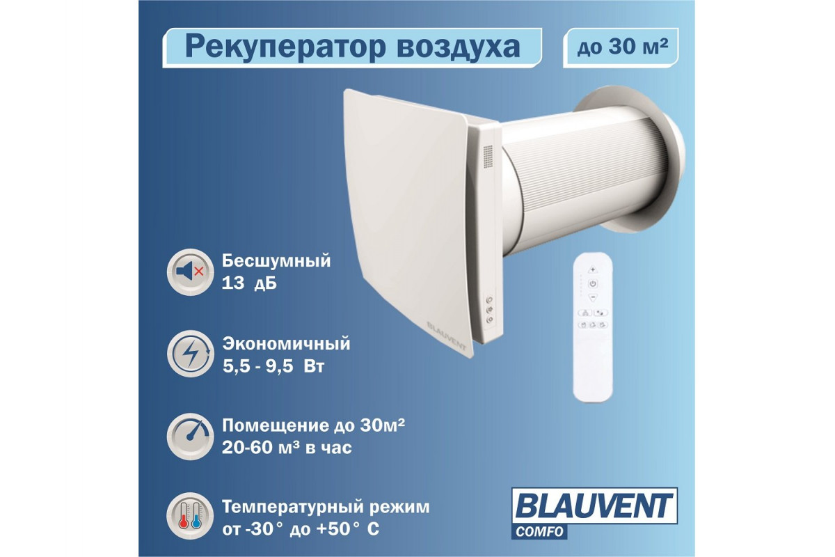 Blauvent COMFO 160 — это современное решение для качественной вентиляции жилых помещений до 30 м². Он сочетает в себе высокую эффективность рекуперации, надёжность, малошумность и энергоэффективность. Благодаря автоматическим режимам, дистанционному управлению и компактному монтажу вы получаете комфортный климат в доме без излишних хлопот и финансовых затрат. Отличный выбор для любых помещений, где важны свежий воздух, уют и тишина!
