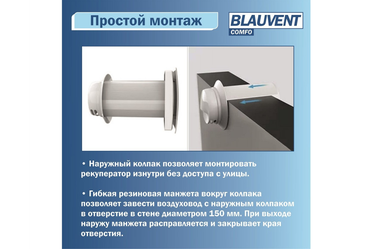 • Компактность и монтаж «внутрь стены» с минимальной глубиной 220 мм и диаметром воздуховода 150–160 мм.