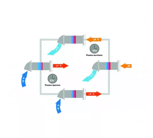 Режим тепловой рекуперации: смена режимов приток/вытяжка каждые ~65 сек для нагрева входящего воздуха без затрат электроэнергии.