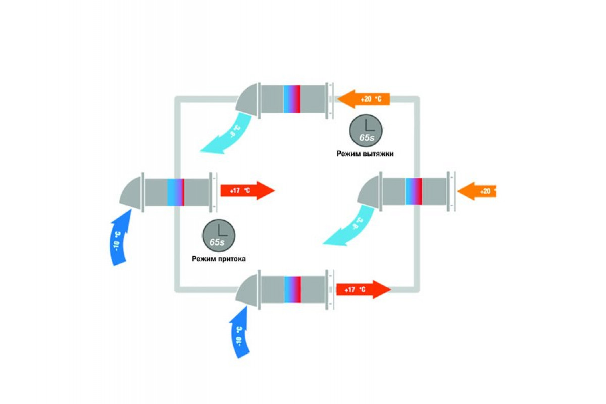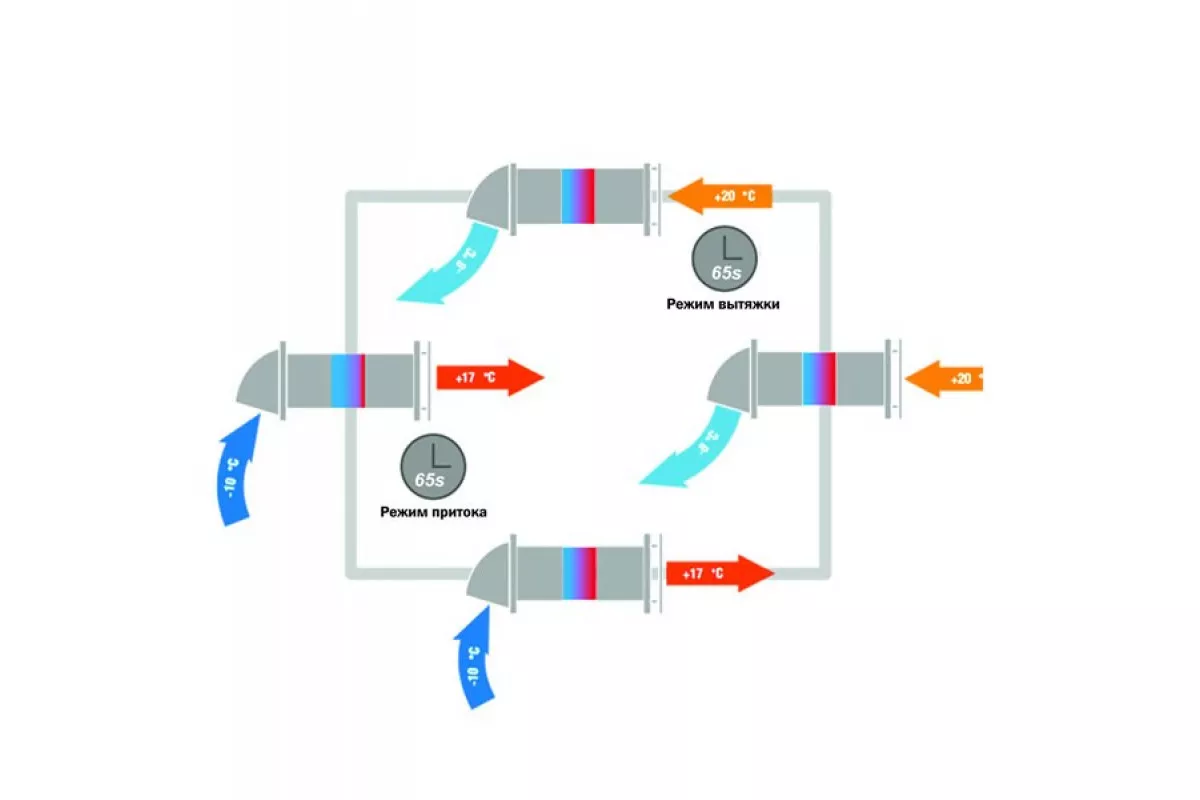 Рекуперация — интеллектуальная смена режимов каждые ~65 сек: теплообменник нагревается теплым воздухом, затем отдает тепло приточному, сохраняя энергию.