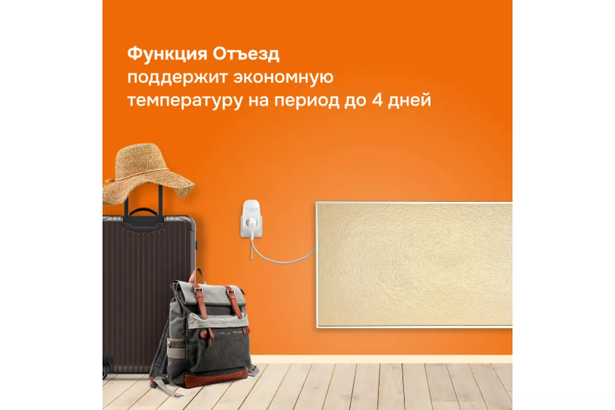 Функция "Отъезд": позволяет поддерживать заданную температуру или отключать обогрев на период до 4 суток, снижая энергопотребление во время вашего отсутствия.