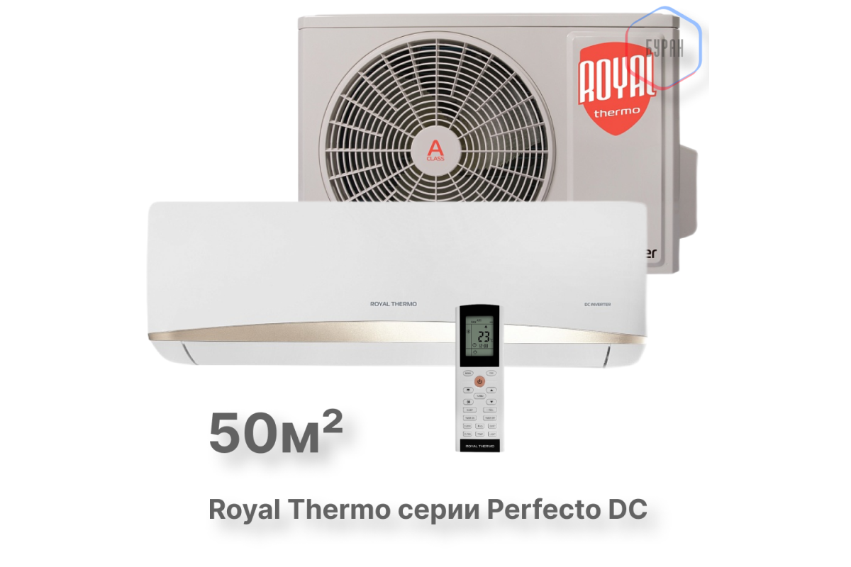 Сплит-система инверторного типа Royal Thermo Perfecto DC RTPI-18HN8 комплект идеально подходит для помещений площадью до 50 м², обеспечивая эффективное охлаждение и обогрев. Это отличный выбор для спальни, кабинета или небольшой гостиной.