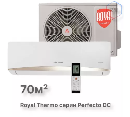 Сплит-система инверторного типа Royal Thermo Perfecto DC RTPI-24HN8 комплект идеально подходит для помещений площадью до 70 м², обеспечивая эффективное охлаждение и обогрев. Это отличный выбор для спальни, кабинета или небольшой гостиной. ​