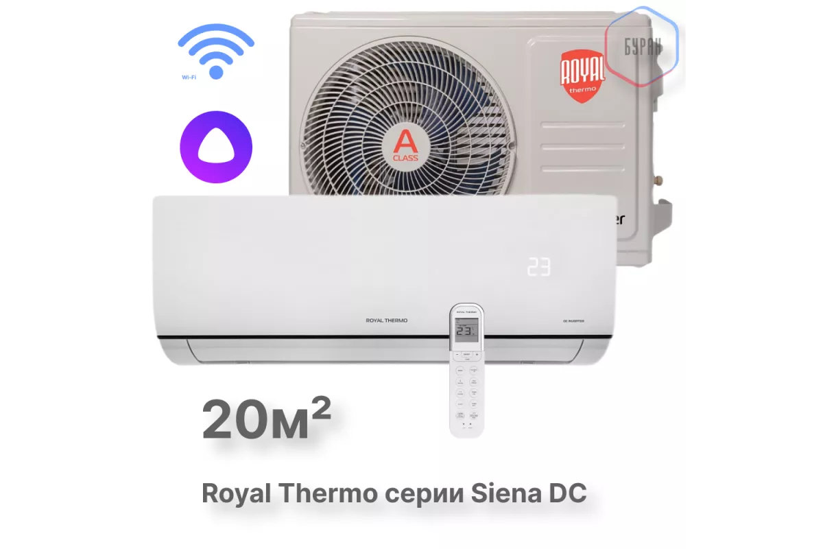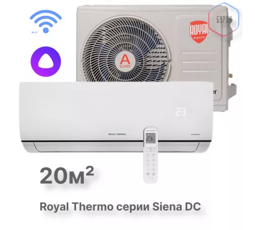 Сплит-система инверторного типа Royal Thermo Siena DC RTSI-07HN8 комплект идеально подходит для помещений площадью до 20 м². Это отличный выбор для спален, небольших гостиных, кабинетов или офисов .​