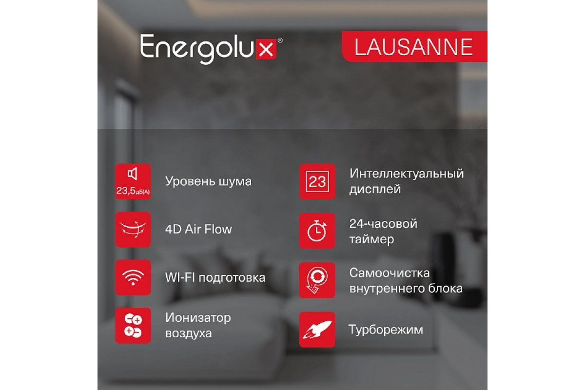Правильный выбор кондиционера – залог вашего комфорта и экономии. Energolux LAUSANNE сочетает в себе высокую энергоэффективность класса A и использование современного хладагента R32, что обеспечивает надежную работу и заботу об окружающей среде.​