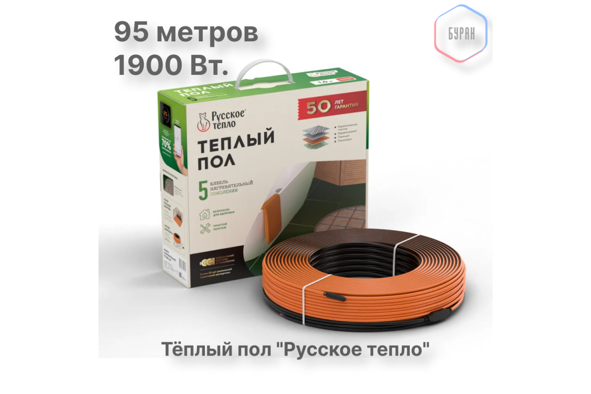 Теплый пол кабельный "Русское тепло" РТ-1900-95,0 — надёжный нагревательный мат под плитку