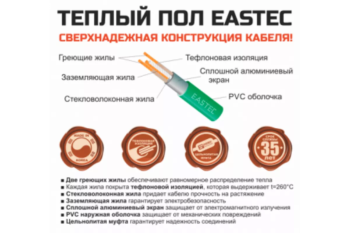 Теплый пол кабельный EASTEC ECC-300 (20-15) - 15 м.п.( 2,0-2,5 м.кв.) комплект — надёжное решение для комфортного обогрева небольших помещений