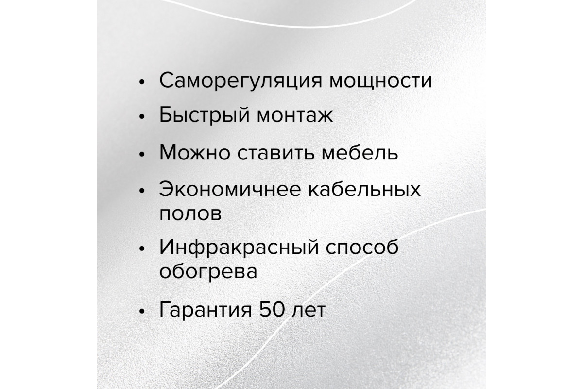 Благодаря инфракрасному излучению с длиной волны 5–20 мкм, теплый пол обеспечивает равномерный прогрев поверхности, создавая комфортные условия в помещении. Антиискровая сетка повышает безопасность эксплуатации, предотвращая возможные короткие замыкания.