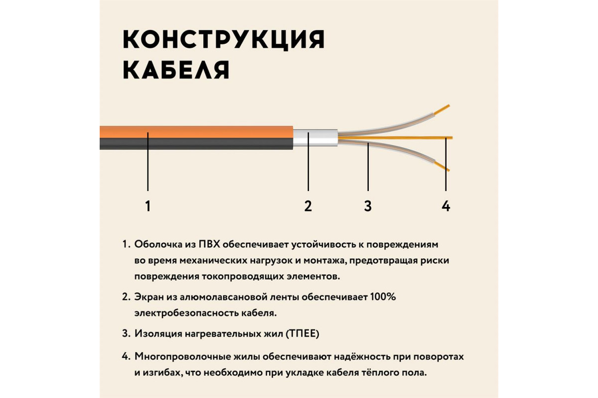 Двужильный кабель равномерно распределяет тепло по всей площади, исключая зоны перегрева. Это особенно важно при укладке под керамогранит, где важно поддерживать стабильную температуру для предотвращения деформации плитки.
