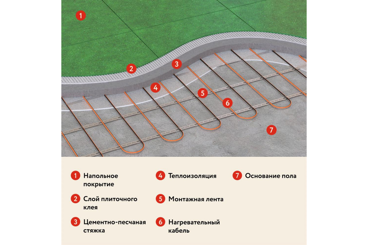 Нагревательный мат выполнен на основе прочной армированной стеклотканевой сетки, к которой равномерно прикреплён тонкий нагревательный кабель. Толщина конструкции — всего несколько миллиметров, что позволяет укладывать мат прямо под плитку, без значительного увеличения уровня пола.