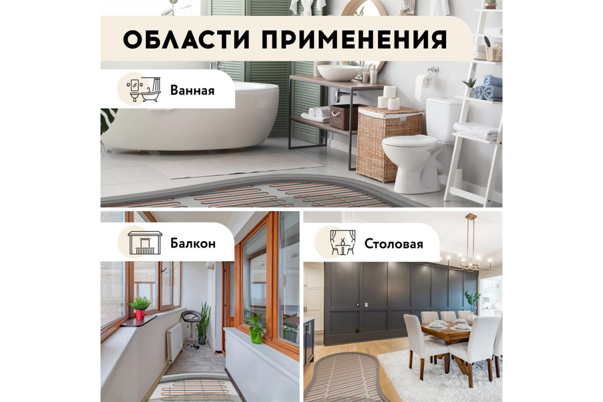 Нагревательный мат "Русское тепло" РТ-230 идеально подходит для помещений с повышенной влажностью и плиточным покрытием: