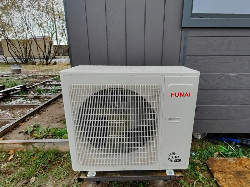 Серия FUNAI ONSEN — это технологичный и надёжный вариант для северных регионов России. Эти тепловые насосы работают по принципу воздух–воздух и обеспечивают стабильный обогрев даже при температуре за окном до –25 °C. Ключевые преимущества моделей, установленных в домах Александра и Константина: