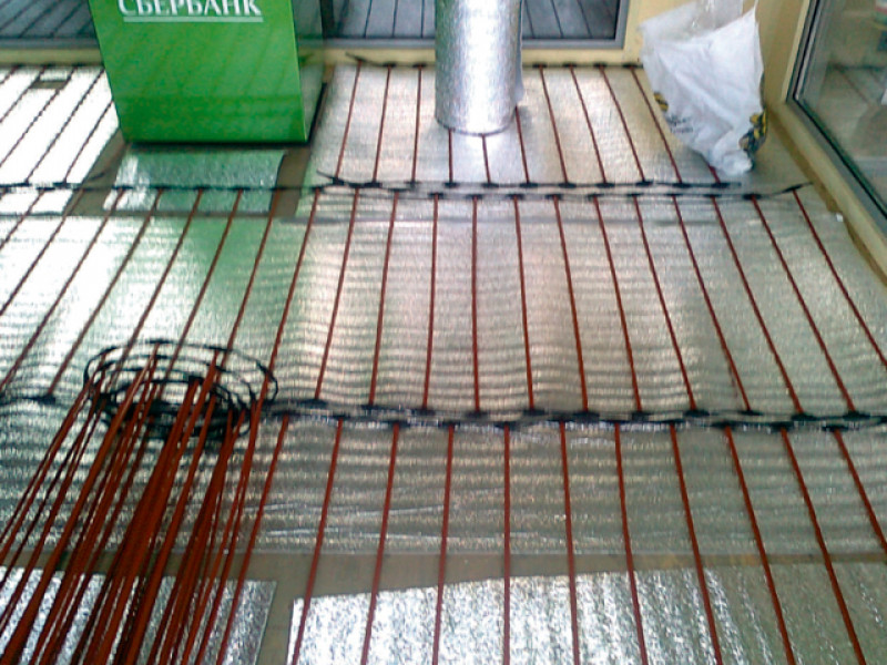 Очередной нестандартной задачей для нашей компании стало обращение крупного заказчика. Новосибирский Сбербанк обозначил потребность в основном отоплении уличных павильонов дополнительных офисов, оборудованных терминалами приема оплаты и банкоматами. На первый взгляд ничего сложного, но усложняющим фактором послужила практически стопроцентное остекление стен. В дополнение к этому, требование заказчика было полное отсутствие видимых отопителей и любых других систем отопления, кроме тепловой завесы над дверью. В помещении необходимо было поддерживать температуру 18 в зимний период. С учётом сурового сибирского климата и высоких теплопотерь помещения сделать это было достаточно непросто. С учётом доли риска на то что система не справиться в сильные морозы было установлено 19 квадратных метров карбонового мата. Что составило практически 100 % от общей площади помещения. За управление системой отопления отвечал один программируемый терморегулятор с двумя датчиками температуры: считывания температура на поверхности пола, и отключения системы по температуре воздуха.