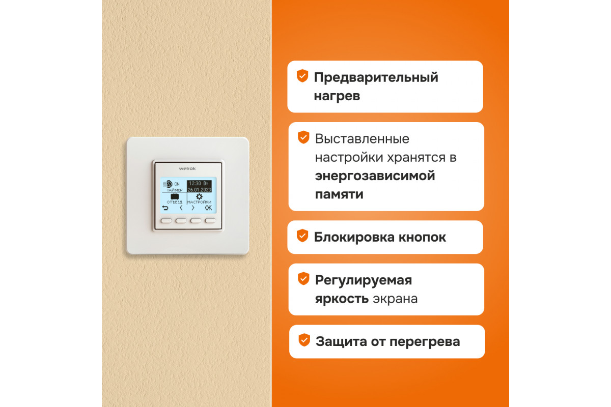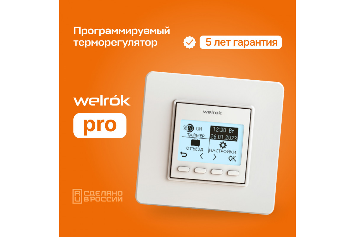 Терморегулятор Welrok Pro — это надёжное и функциональное решение для управления тёплым полом. Он обеспечивает комфортную температуру, экономит энергию и легко настраивается под индивидуальные потребности пользователя. Благодаря высокому качеству и продуманному дизайну, Welrok Pro станет отличным выбором для вашего дома или офиса.​