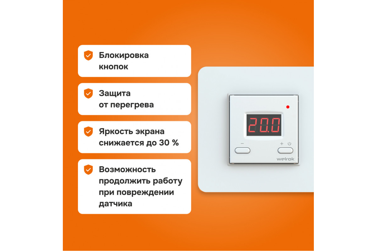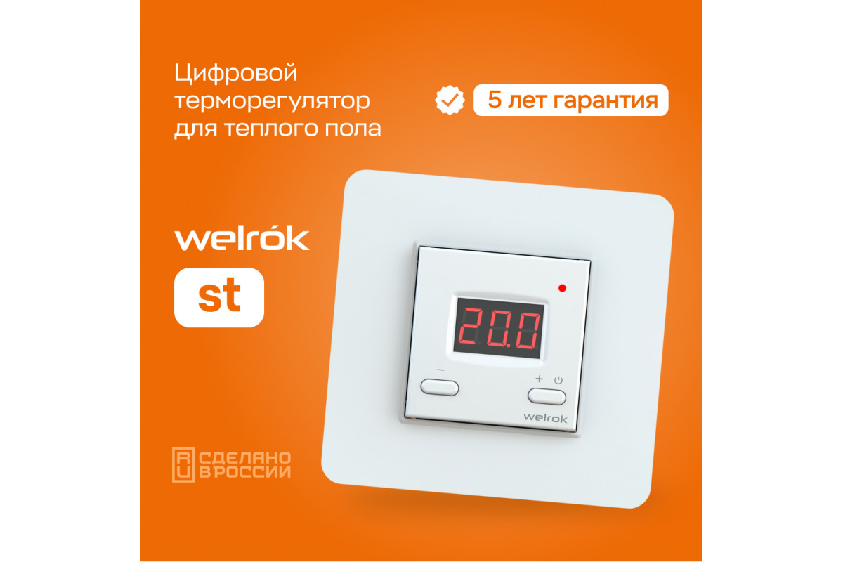 Терморегулятор Welrok ST — это надёжное и удобное решение для управления системами тёплого пола. Он обеспечивает точный контроль температуры, прост в установке и использовании, а также обладает современным дизайном, подходящим для любого интерьера. Приобретая Welrok ST, вы получаете качественный продукт с гарантией 5 лет и возможностью консультации в нашем интернет-магазине.