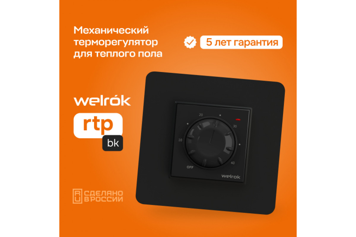 Welrok RTP BK оснащён механическим регулятором температуры, что обеспечивает интуитивно понятное управление без необходимости программирования. Пользователю достаточно установить желаемую температуру с помощью поворотной ручки.​