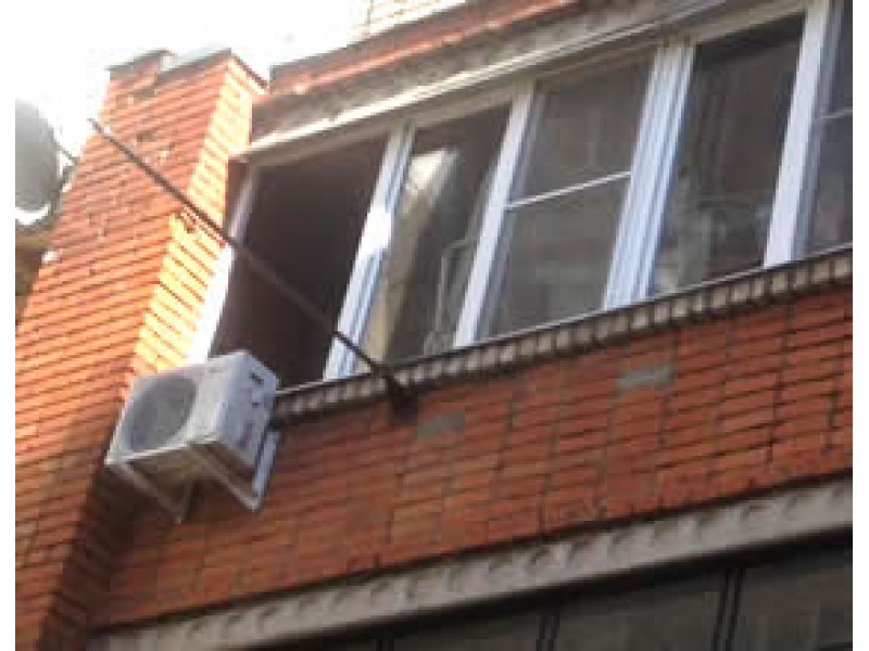 Внутренний блок размещен над окном. Внешний блок вынесен на ограждение балкона, с доступом к нему через правое крайнее окно.